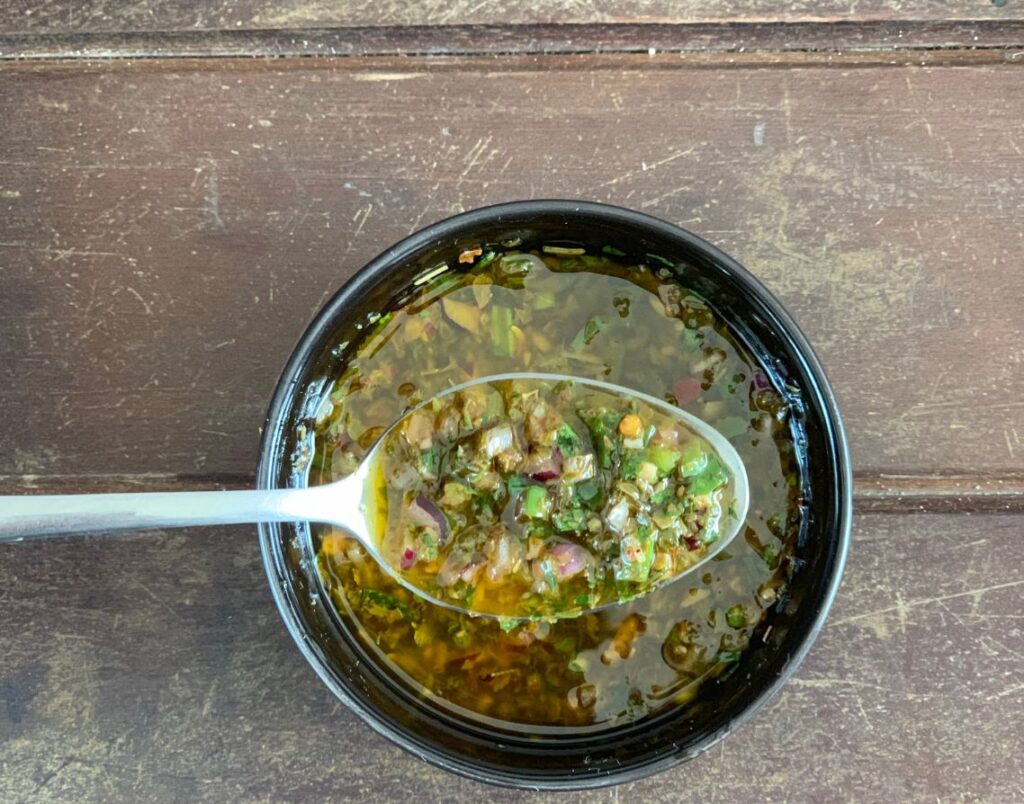 In a food processor add the jalapeno, garlic cloves, and chopped onion. Pulse until finely chopped. Add the cilantro and parsley, using only the greens and thin stems. Pulse until finely chopped. Add the lime juice, olive oil, cumin, coriander, and sea salt. Pulse until well combined.