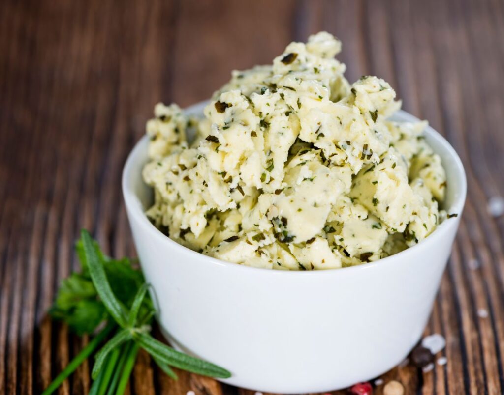 In a medium bowl, mix the butter, finely minced herbs, and pressed garlic. Add fresh ground pepper to taste. Mix well until evenly combined.